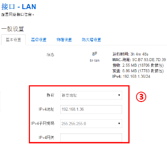 3.修改網橋的管理IP地址:網絡,接口,點擊修改,基本配置里可以進行操作,點擊“保存&應用”;